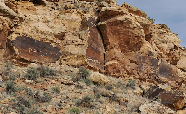 The next stop was a petroglyph panel in Apple valley. We took a good dirt road for 5.5 miles and a not good dirt road for 0.5 more miles to a point of a cliff. the petroglyphs are below the point